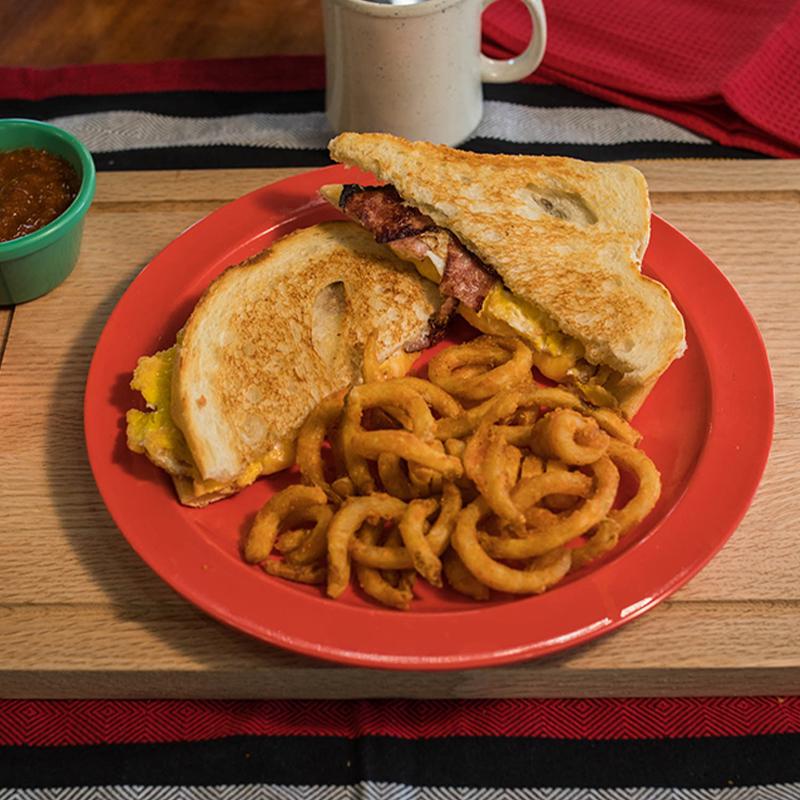 Sourdough bread, mayo, chiptole dressing, egg, ham, bacon & swiss cheese. Accompanied with your choice of French fries, Curly fries or Onion Rings (+$2.00).