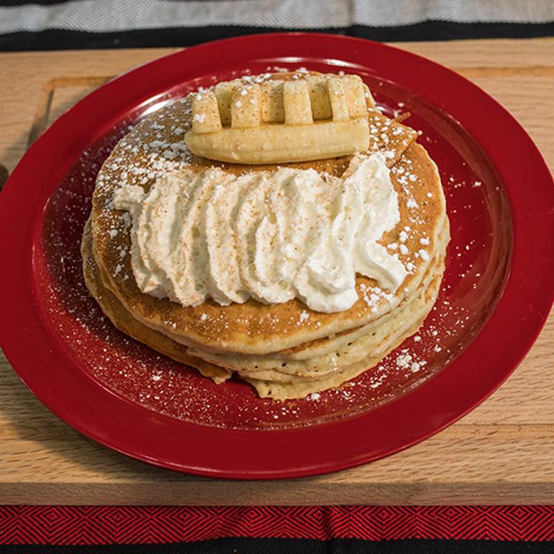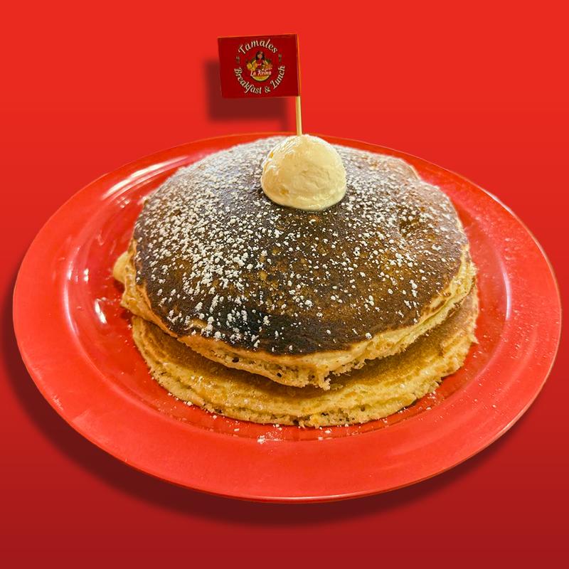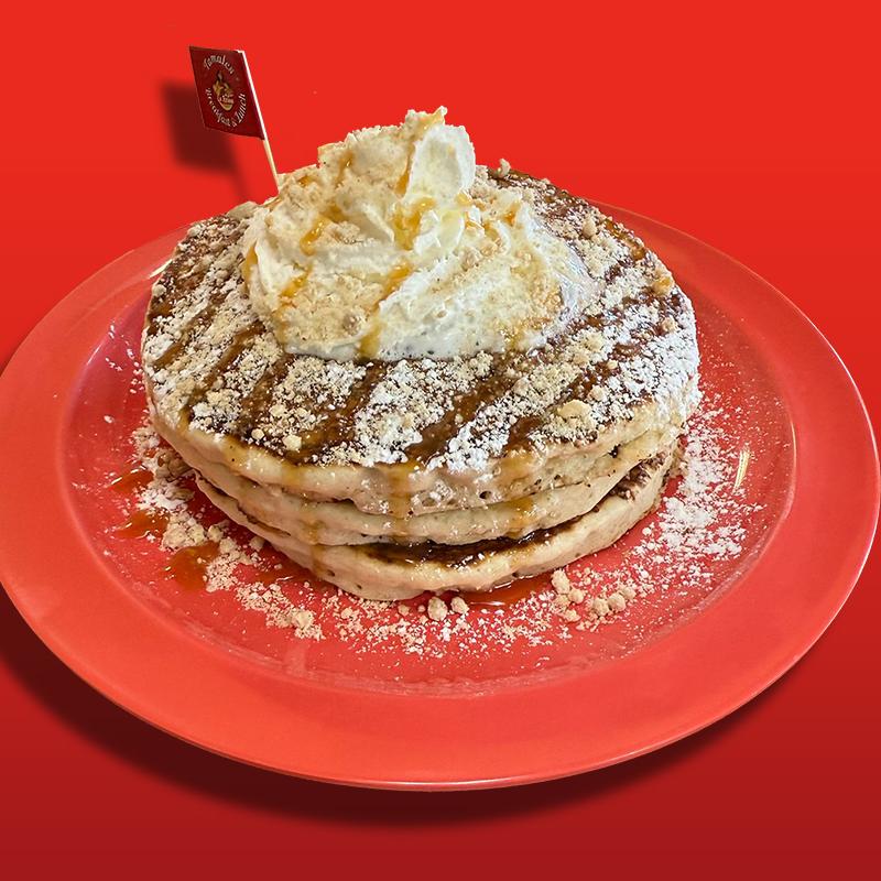 3 pancakes filled with mazapan crumbles, topped with mazapan crumbles, caramel sauce, whipped cream, & powdered sugar.