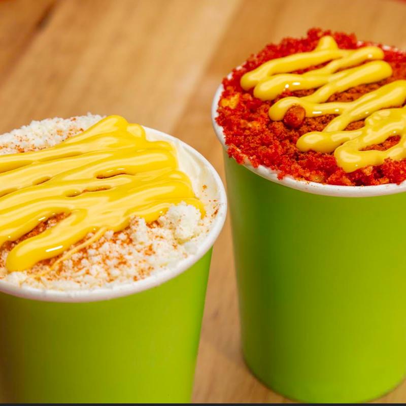 Corn in a cup with mayo, cotija cheese, chili powder & butter. May add cheetos.