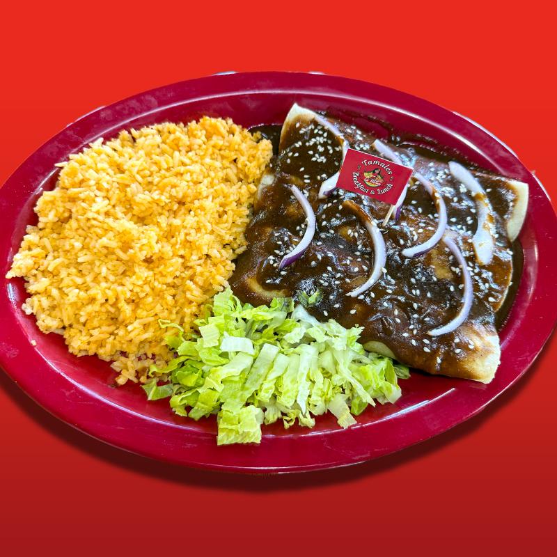 3 rolled tortillas with shredded chicken topped with mole poblano, sour cream, cotija cheese, sesame seeds, & onions. Accompanied with Rice, & your choice of beans or lettuce.