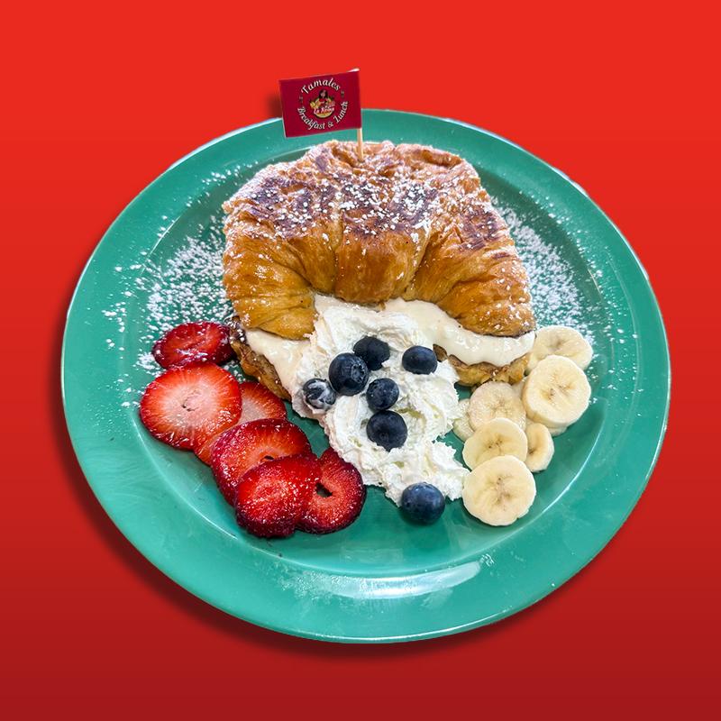 Buttered Croissant covered in our homemade french toast mix & filled with our 4 cheese cream filling, topped with banana, strawberries & blueberries, comes with whipped cream & powdered sugar.