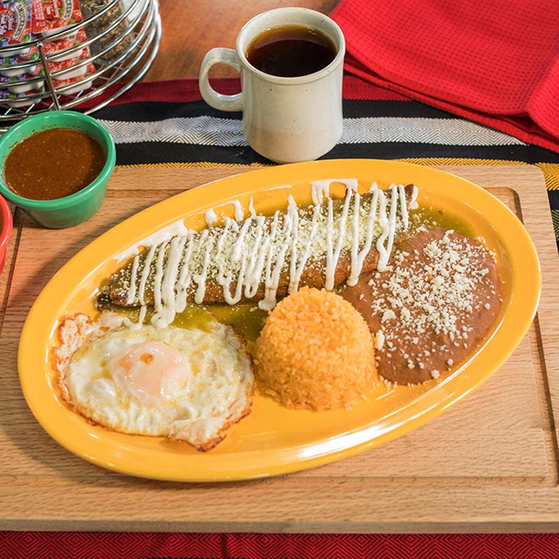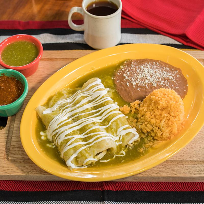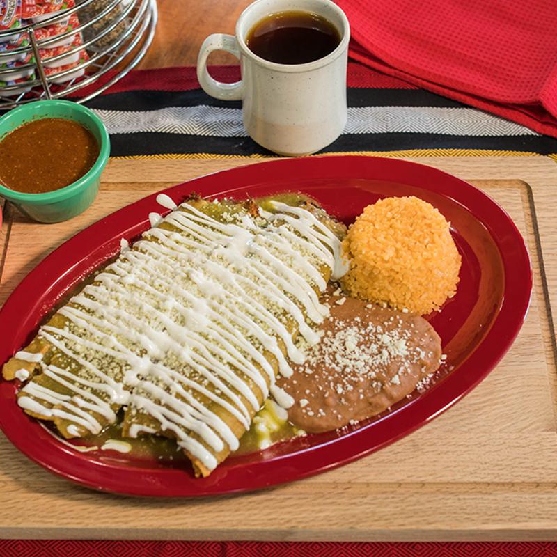 3 rolled tortillas with shredded chicken, topped with green salsa, melted cheese & sour cream. Accompanied with rice & beans.