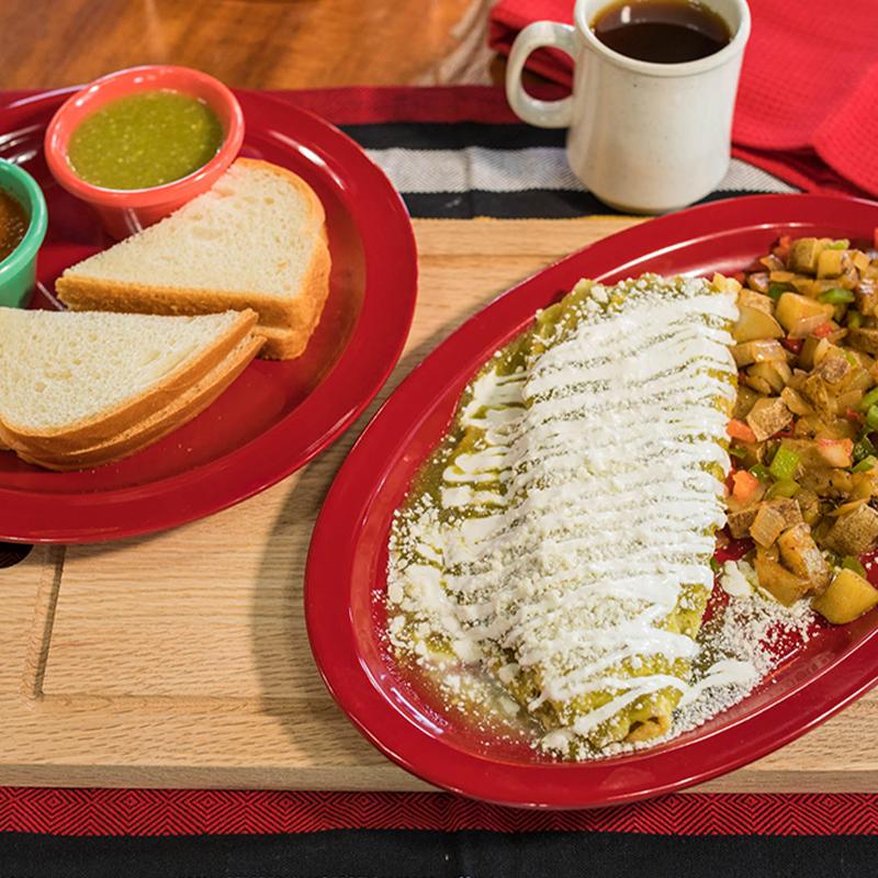 1 tamal of your choosing inside an omelette with cheese topped with cotija cheese, sour cream & red or green salsa. Accompanied with our house potatoes & a side of toast.