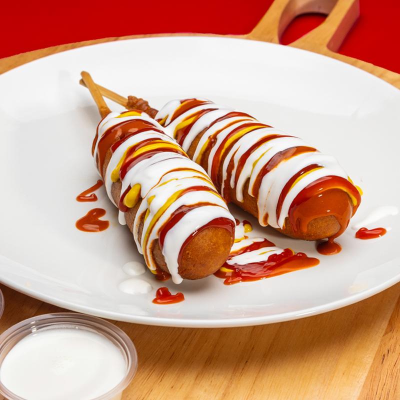 Battered corn dogs. Served with ketchup, mustard, sour cream & valentina. Comes in an order of 2.