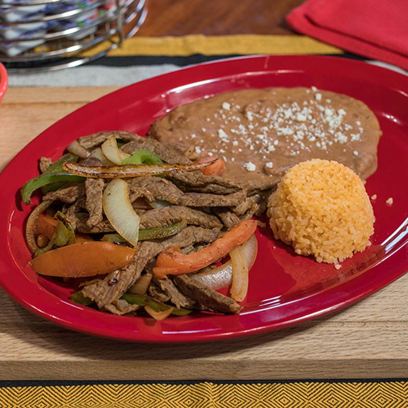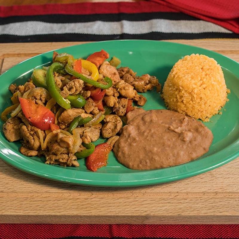 Chicken breast sautéed with onion & bell peppers. Accompanied with rice, beans & your choice of corn or flour tortillas.