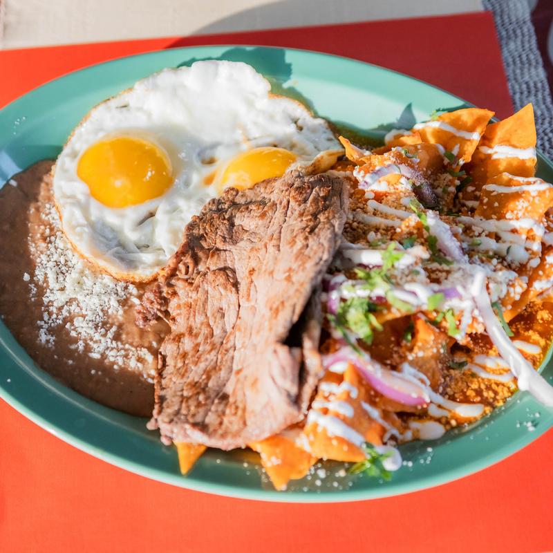 Chilaquiles (red or green), topped with sour cream, cotija cheese, onion & cilantro. Accompanied with 2 eggs your way & beans. Shredded chicken (+$3.00), Carne asada (+$5.00).