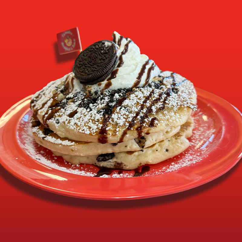 3 pancakes filled with oreo crumbles, topped with oreo crumbles, whipped cream, powdered sugar & chocolate sauce.
