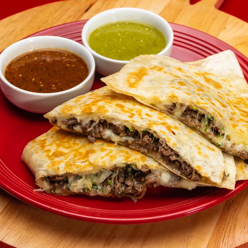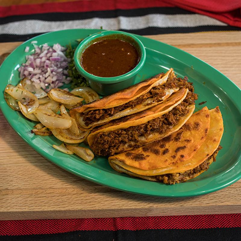 Grilled homemade masa filled with monterrey jack cheese & your choice of meat (asada, chicken, adobada, or chicharron verde), comes with cilantro, onion, & green or red salsa. Birria (+$1.00).