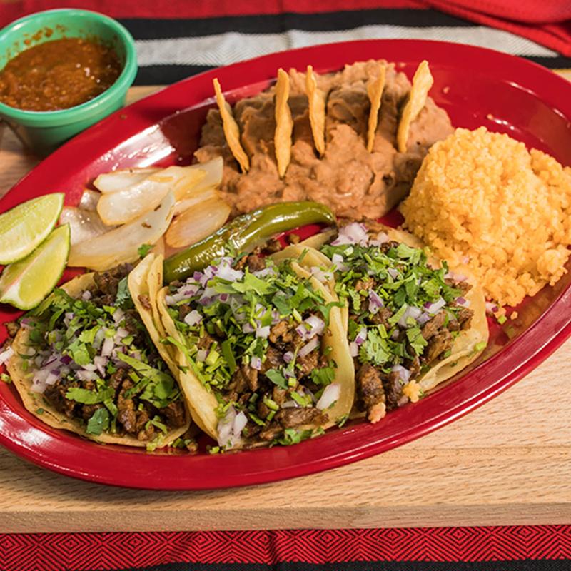 3 tacos with your choice of meat (asada, chicken, adobada) topped with cilantro & onion. Accompanied with rice, beans, grilled onions, grilled serranos & red or green salsa. For cheese (+$1.50).