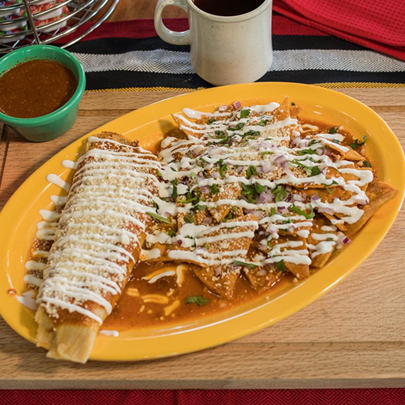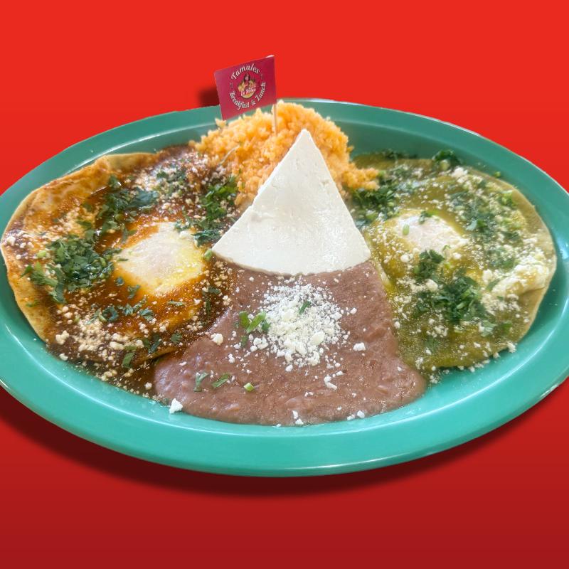 Roll Bread with 1 tamal of your choosing topped with green or red salsa, sour cream, cotija cheese, accompanied with 1 egg your way & chilaquiles (red or green), topped with sour cream, cotija cheese, onion, & cilantro.