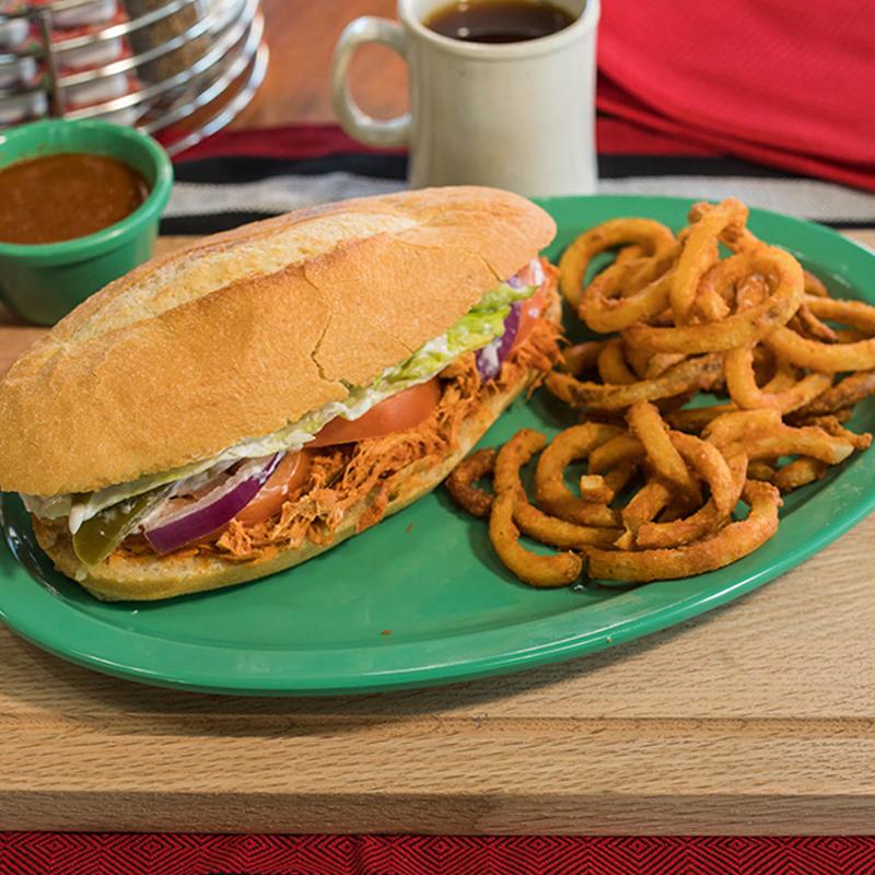 Roll bread with marinated shredded pork meat topped with tomato, onion, lettuce, jalapenos, sour cream, mustard & mayo. Accompanied with curly fries, French fries or onion rings (+$2.00).