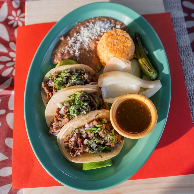 Meats, asada, or adovada or chicken cilantro, onion, and red or green sauce.