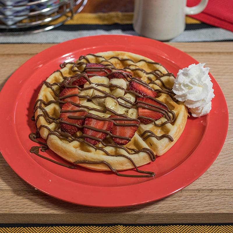 Waffles topped with strawberries & bananas, whipped cream, nutella & powdered sugar.