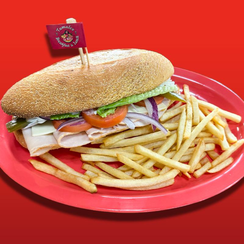 Roll bread with 4 slices of turkey ham, swiss cheese, lettuce, tomato, onion, pickled jalapenos, sour cream & mayo. Accompanied with Curly fries, French fries or onion rings (+$2.00).