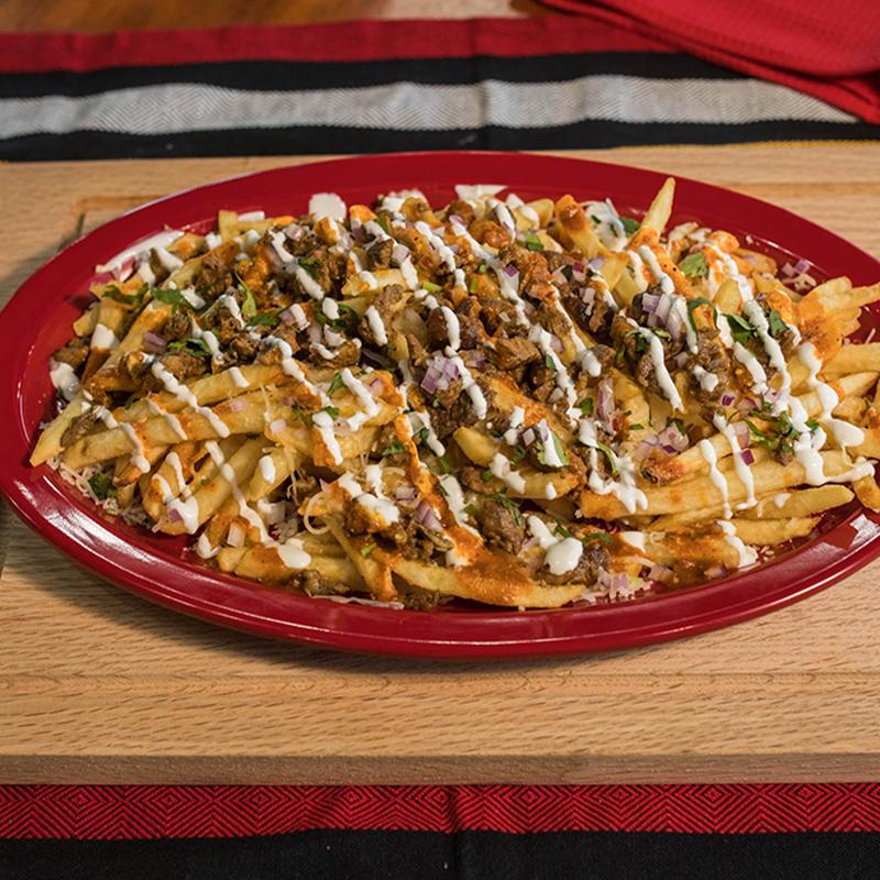 French fries, your choice of meat (asada, chicken, adobada), cilantro, onion, sour cream, cheese & red or green salsa.