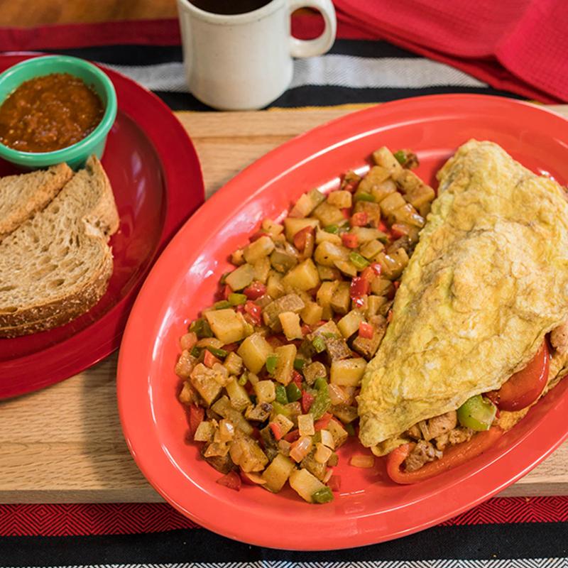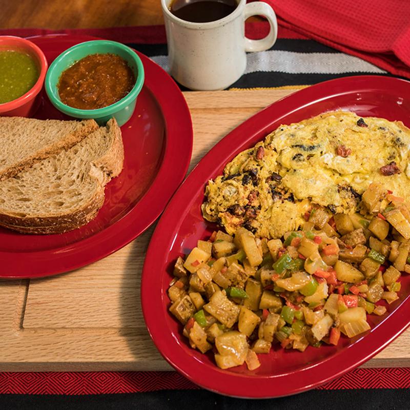 Omelette with cheese, jalapenos, onion, tomato, & cilantro. Accompanied with our house potatoes & a side of toast