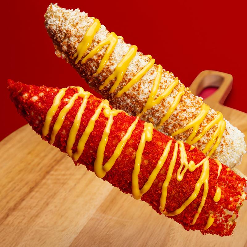 Corn on a stick, with mayo, cotija cheese, chili powder & butter. Add Cheetos (+$0.60).