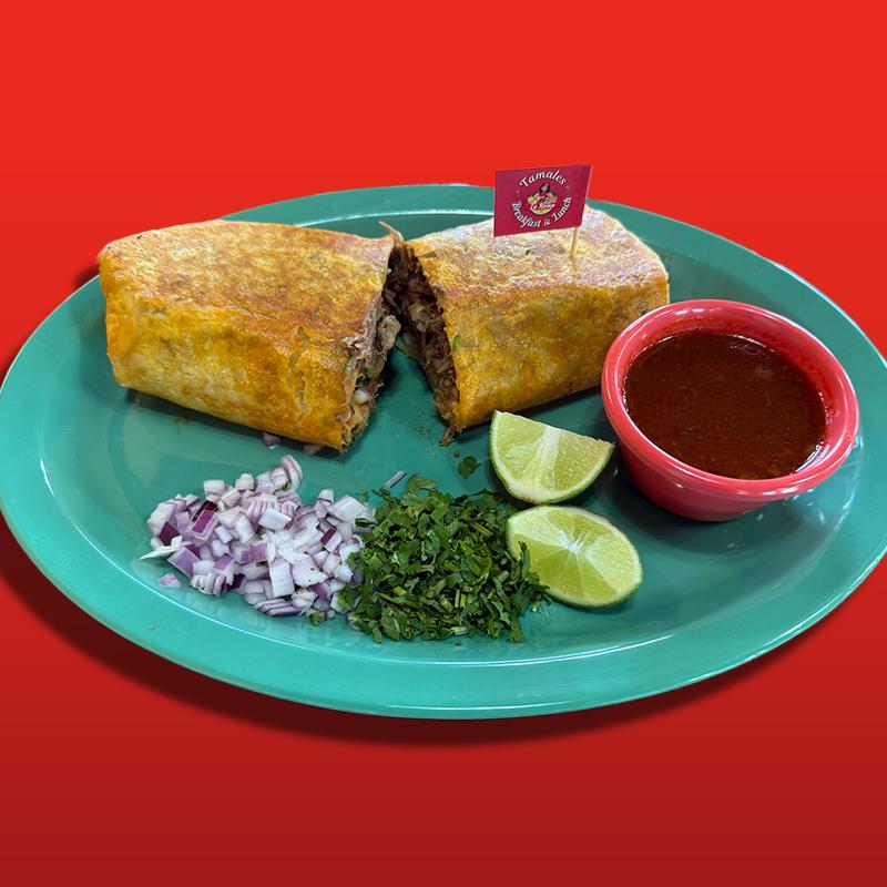Flour tortilla, birria, rice, beans, cilantro, onion, cheese & a side of consome.