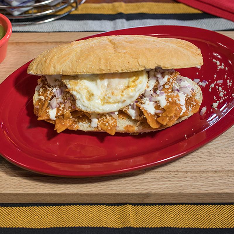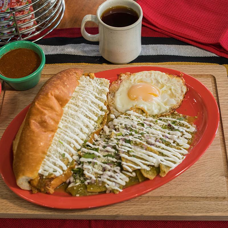 Roll bread with chilaquiles (red or green), topped with sour cream, cotija cheese, onion & cilantro. Accompanied with 1 egg your way.
