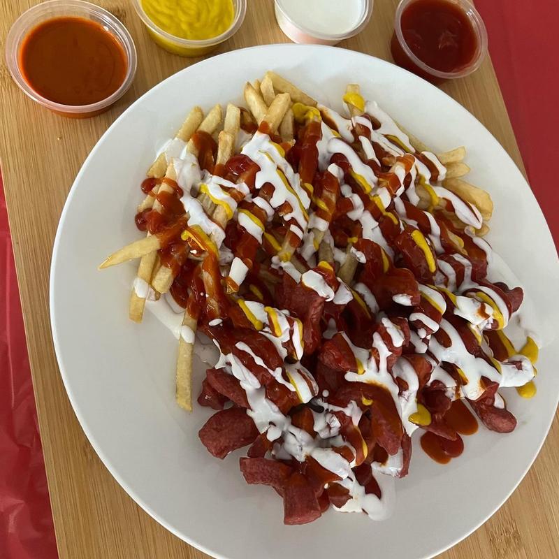 Hot dog weiner deep-fried, topped with ketchup, mustard, sour cream & valentina. Accompanied with french fries.