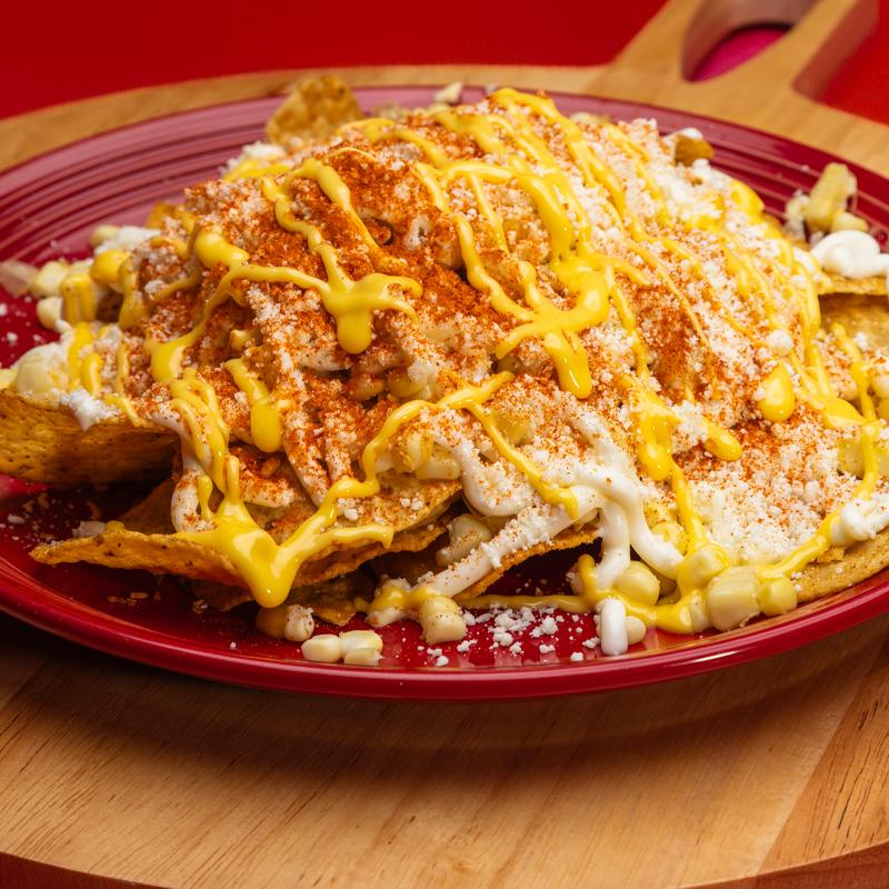 Tostito chips topped with corn, mayo, cotija cheese, chili powder & butter.