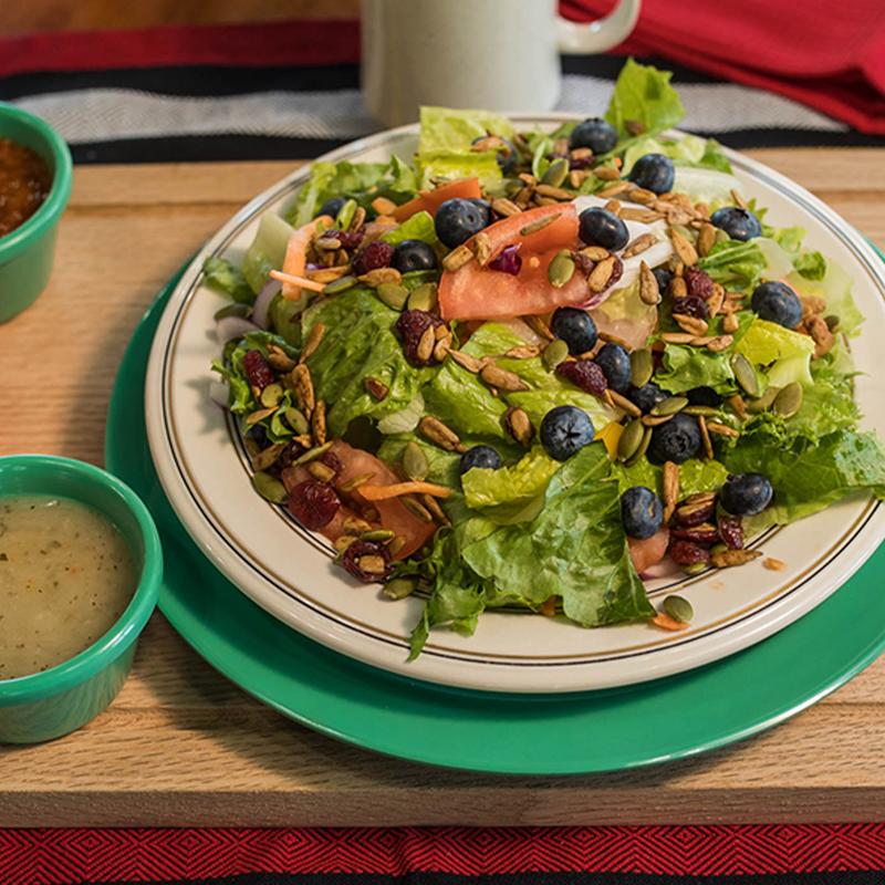 Salad mix, bell peppers, shredded carrots, cucumber, avocado, pumpkin seeds, sunflower seeds, dried cranberries, blueberries. Dressings: Caesar, italian, thousand island & ranch,