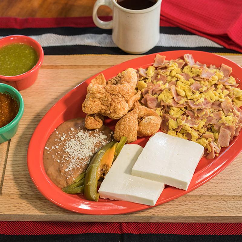 3 scrambled eggs with ham, accompanied with beans, panela cheese, pork rinds, pickled jalapenos. Comes with corn tortillas or flour tortillas.