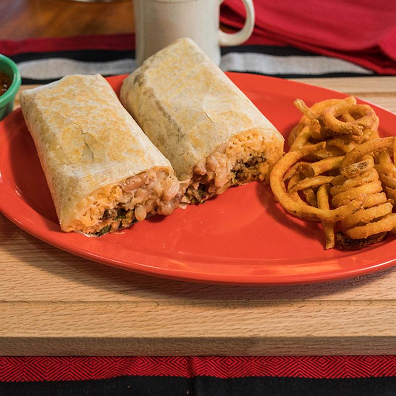 Flour tortilla, your choice of meat (asada, chicken, adobada) rice, whole beans, cilantro, onion, sour cream, cheese, & salsa. Accompanied with Curly fries, French fries or Onion rings (+$2.00). Wet burrito, red or green, (+$2.00).