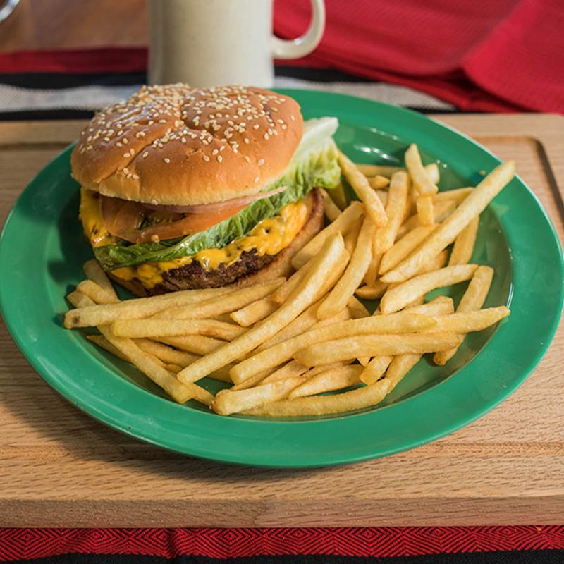 Hamburger bun, patty, mayo, tomato, onion, lettuce, american cheese. Accompanied with Curly fries, French fries & Onion rings (+$2.00). Extra patty (+$4.00).