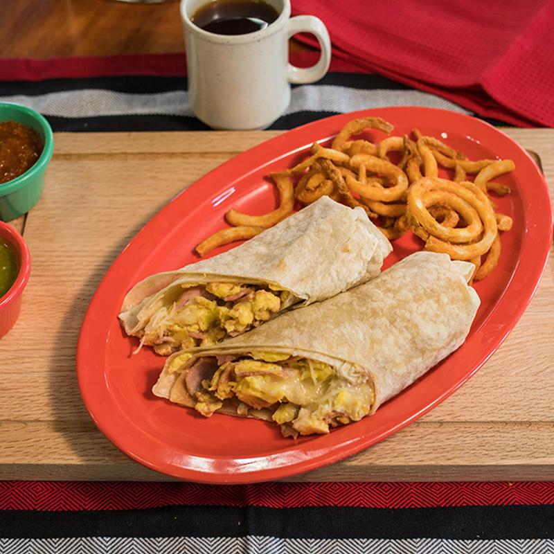 Flour tortilla, 3 eggs, ham, beans, & cheese. Accompanied with your choice of French fries, Curly fries or Onion rings (+2.00). Wet Burrito, Red or green, (+$2.00).