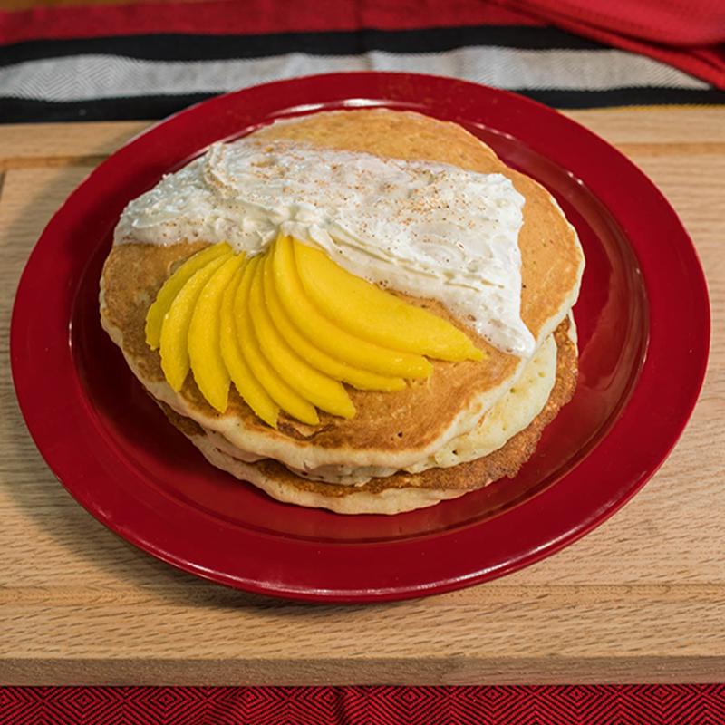 3 pancakes filled with mango, topped with mango, whipped cream & powdered sugar.