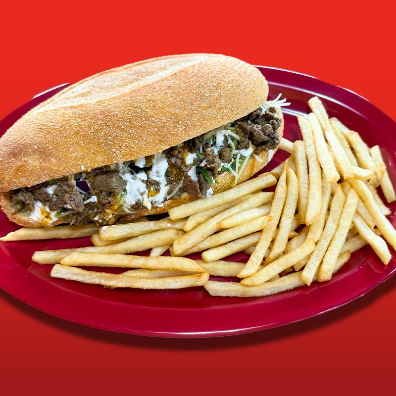 Roll bread with meat (Asada, Chicken, Adobada), topped with beans, cilantro, onion, cheese & salsa on the side. Accompanied with curly fries, French fries or onion rings (+$2.00). Birria (+$3.00).