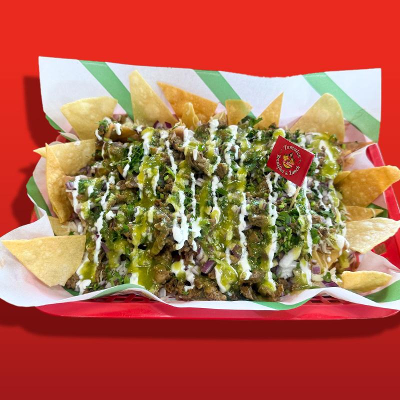 Tortilla chips, your choice meat (asada, chicken, adobada), cilantro, onion, sour cream, cheese, refried beans & red or green salsa.