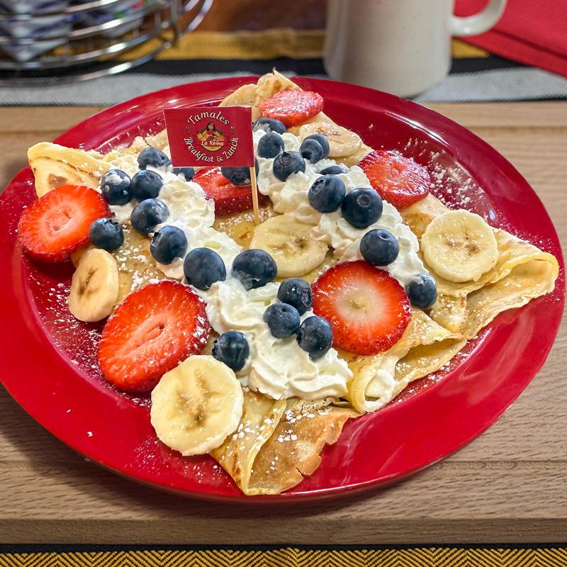 3 crepes filled with our 4 cheese cream filling, topped with strawberries, bananas & blueberries, whipped cream & powdered sugar.