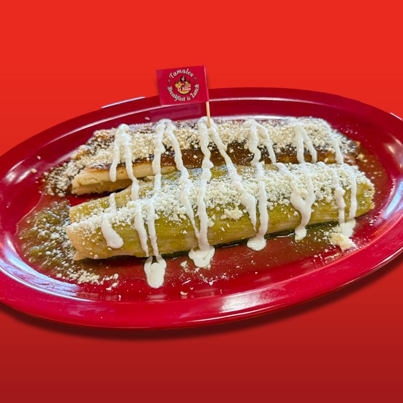 2 Tamales topped with Sour Cream, Cotija Cheese, Red or Green salsa. Flavors:Red Pork, Green Chicken, Jalapeno w/ Cheese, Mole w/ Chicken, Bean & Cheese, Sweet Corn, Strawberry, Pineapple. Comes in an order of 2. Deep-fried (+$1.50).